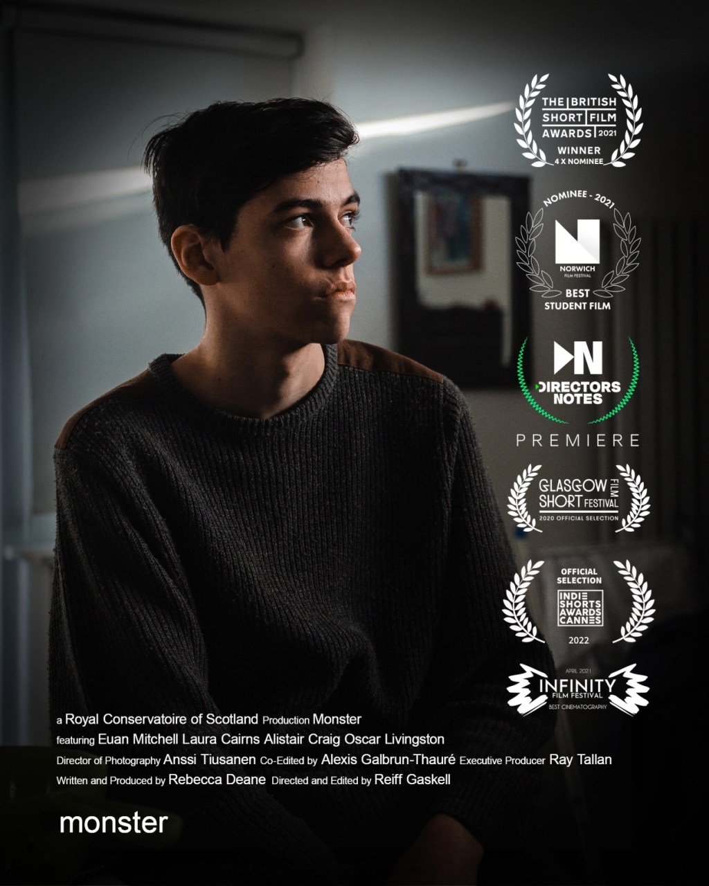 Reiff’s debut short MONSTER, an unnerving tale dealing with a psychiatric disorder and the judgement that comes along with it, premiered at the Glasgow Short Film Festival. It went on to be nominated at the Norwich Film Festival and winning Best Scottish Film at the British Short Film Awards, nominated for an additional 3 including Best British, before being featured by Director’s Notes.